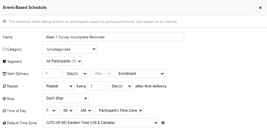 To begin, we will create a schedule Based on Participant Events, where the event is set to Enrollment. We will set the trigger logic to run 1 day after Enrollment and repeat every 1 day so that all applicable participants will receive this notification.