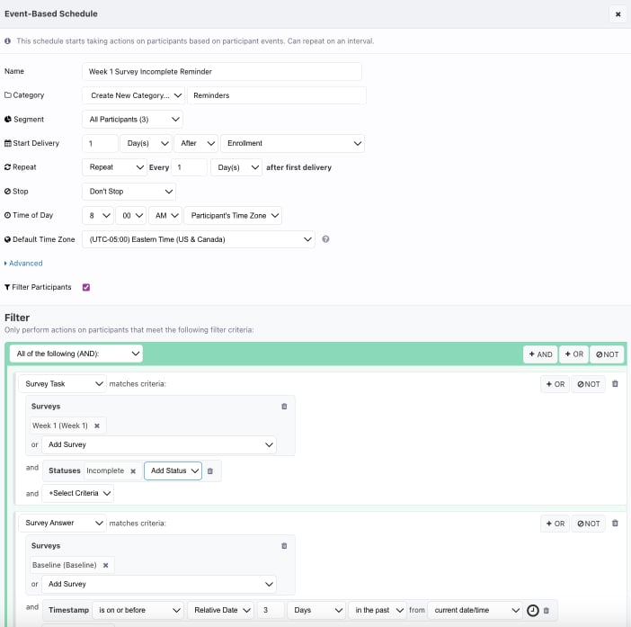 Next, you will need to use the "Filter Participants" section to identify participants that have completed the "Baseline" survey more than 3 days ago and have not yet completed the "Week 1" survey.