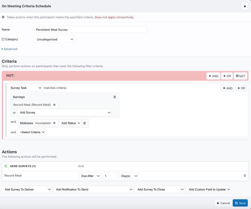 To set up the schedule, you'll want trigger criteria such that any time there is not an incomplete (available) instance of the survey, the system will deliver a new one. Below is a screenshot outlining how a meal survey will be delivered any time there is not an available, incomplete survey.