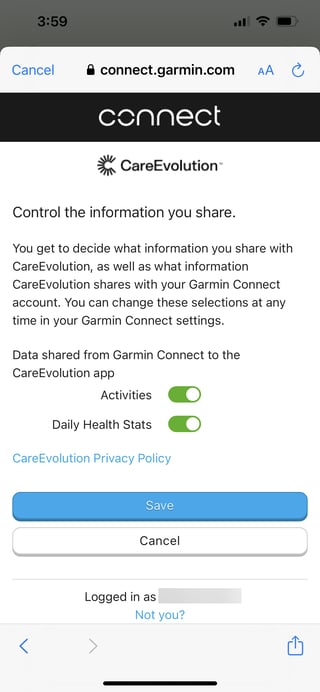 The participant will be prompted to log in to their Garmin Connect account and select what data types they wish to share before agreeing to connect.