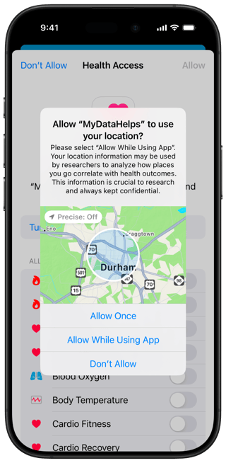 On iOS devices, MyDataHelps can track the participant's location. Apple's location tracking service operates in a power-efficient manner, with little to no impact on battery life.