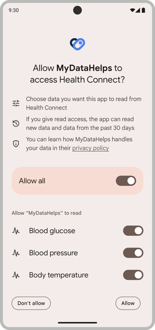 When the participant enrolls in the project in the MyDataHelps Android app, the app will ask them which sensor data they want to share. They can elect to share some, all, or none of the requested data. If the participant has elected to share sensor data, Health Connect will attempt to collect data for the last 30 days and updates going forward shares continuously throughout the day.