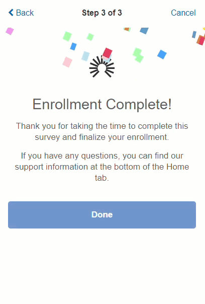 The Celebration step allows you to add simple text content, with a confetti animation. This is commonly used at the end of a survey to celebrate completion of the task.