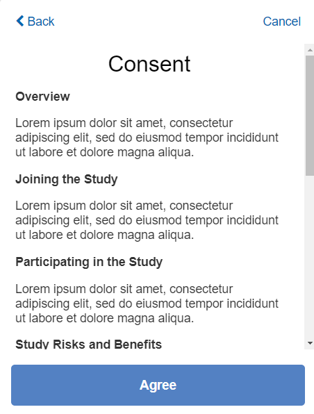 The consent step allows the user to review and sign the selected consent document. Study teams can access consent documents through the Survey Results viewer or exported using the Consent Documents Export Format. Participants can view their signed consent documents by selecting the project in the Account tab of MyDataHelps. See creating a consent survey for more information.