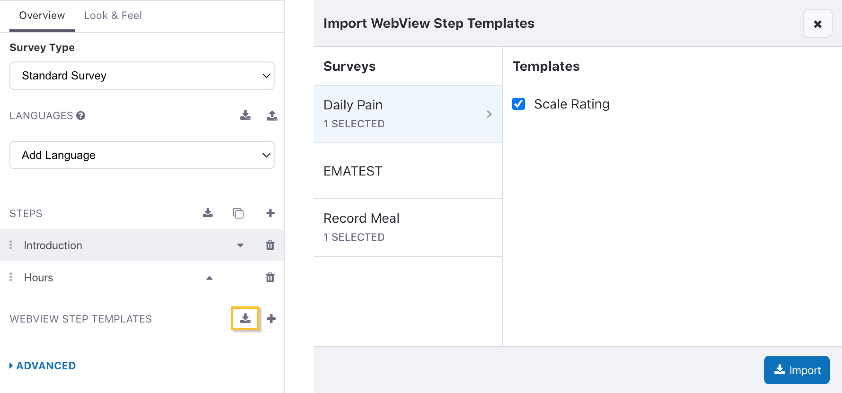Templates can be imported from other surveys within the same workspace by clicking the "import" icon, and selecting one or more templates to import. Once imported, changes to Web View Step Templates are not synchronized across surveys so they can be modified to suit each distinct survey.