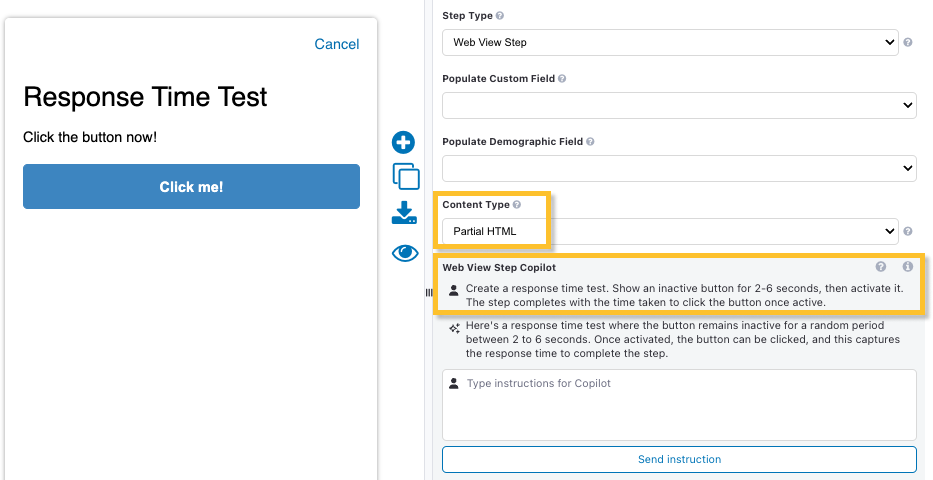 In most scenarios, it is recommended to use the Partial HTML content type with your Standard Survey V2 since it loads your survey's Look & Feel settings. Additionally, an optional Web View Step Copilot is available, which uses AI to help you generate code for your Web View step. Here are a few tips on using the copilot: