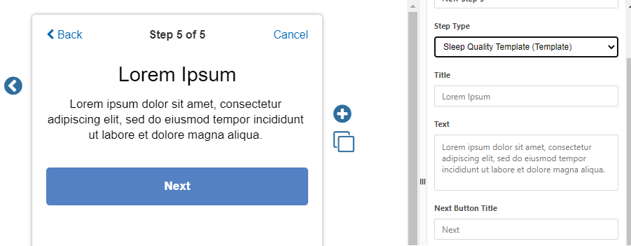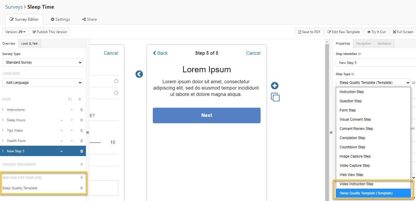 Sometimes you will have several different steps within a survey utilizing the same custom web view design. Perhaps you have a unique style for your instruction steps, or several different mood questions that have the participant choose from a range of emoji. Web view step templates allow you to have multiple steps with similar looks and functionality, but individualized message prompts.