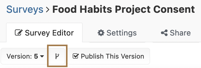 Surveys support version control, which allows you to track, compare, and even revert changes. Once a survey has been published to a project, a tag on the Surveys tab will indicate the project name and version published to that project. Note that different versions of a survey can be published to different projects.