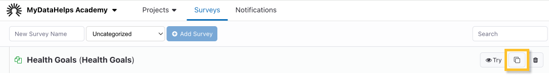 When your project's surveys have similar formats and steps, copying an existing survey allows you to use those elements without having to create a new survey from scratch. Copying an existing survey can save time when building out your project.