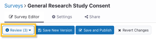As you configure your survey and are ready to save and or publish a new version, you may be prompted with a Review button.
