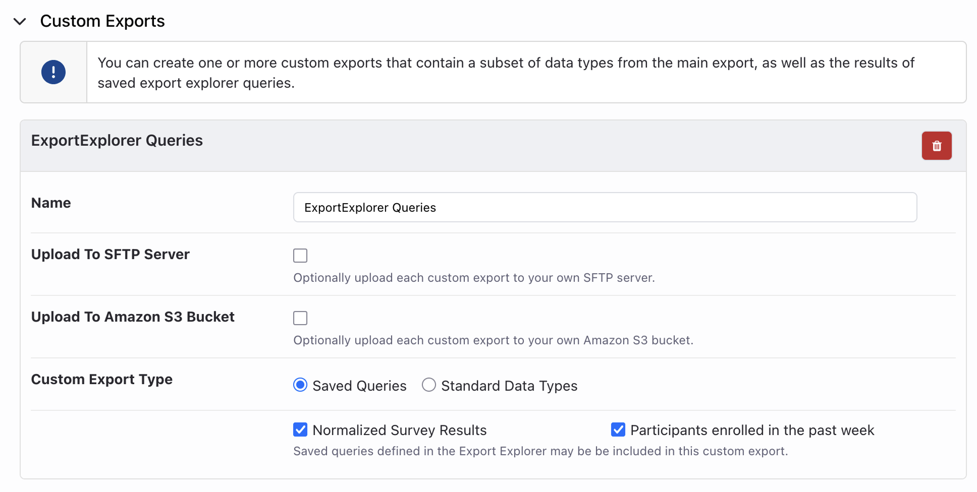 In addition to your primary incremental export, you can configure one or more Custom exports with specific subsets of project data. Custom exports can be configured as one of two types:
