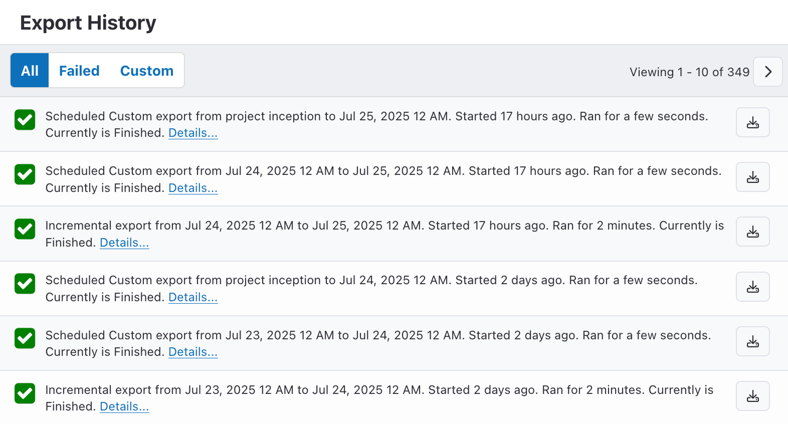 Additionally, you may notice that the incremental export range differs from the configured interval (i.e. daily, weekly) when you first turn on exports or update the settings. This could be due to a variety of reasons, such as: