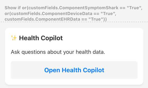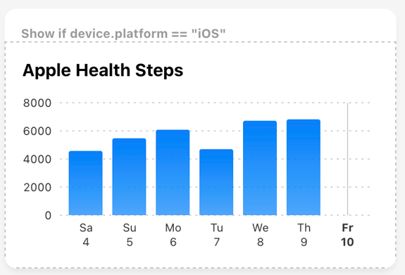 Most often, you'll want to use piping expression (see above) within a conditional component. This allows you to hide or show the components nested within the conditional if the expression evaluates as true, for example, showing a graph of Apple Health steps if they are on iOS: