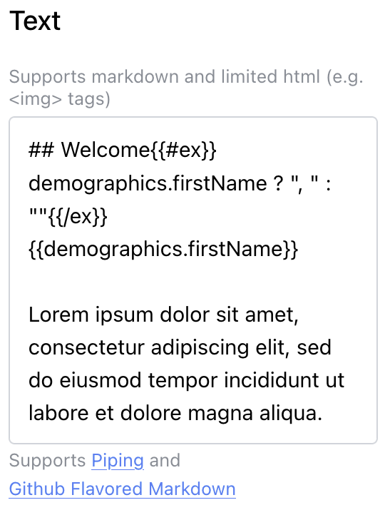 The MyDataHelps View Builder supports mustache.js syntax for piping participant, project, or device fields in all text fields. For example, to insert the participant's first name, you can use: