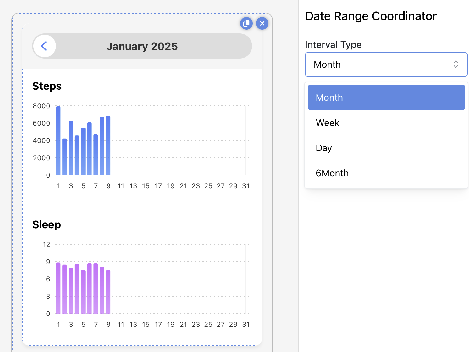 In the below example, participants can use the back arrow by the month and year to view their Steps and Sleep from prior months. If you change the coordinator to use a week interval type, participants will only see data for the past week and the back arrow will navigate back one week at a time.