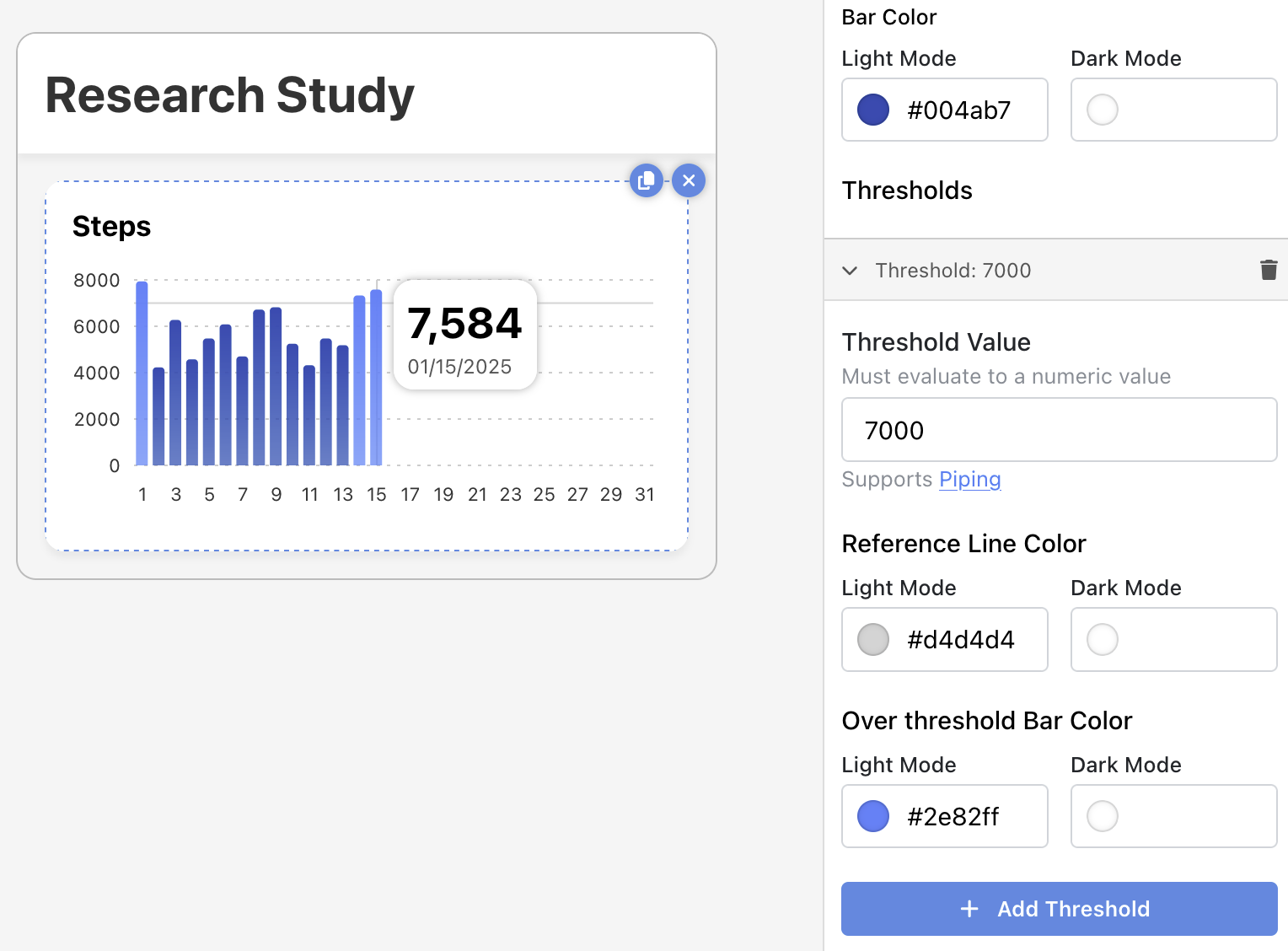Thresholds make data charts much more engaging. For example, in a daily data chart, if a daily value is above the threshold, it can change color. This is a great way to visually indicate goals or upper limits for health data. You can also add a reference line which will show where the threshold is. While the below example uses "7000" as the threshold value, the threshold value supports piping and most projects will instead want to use a custom field (e.g., customFields.StepGoal