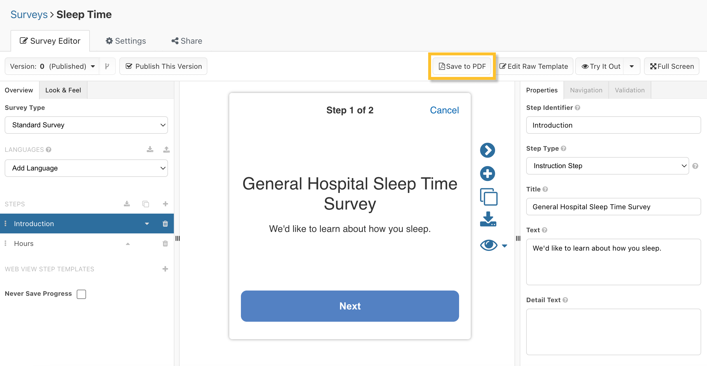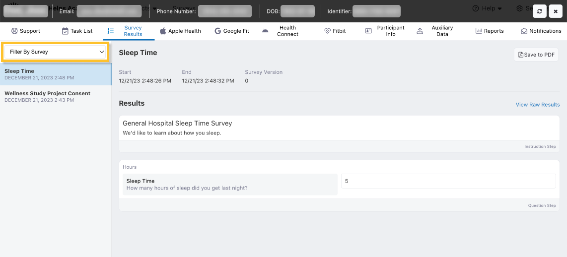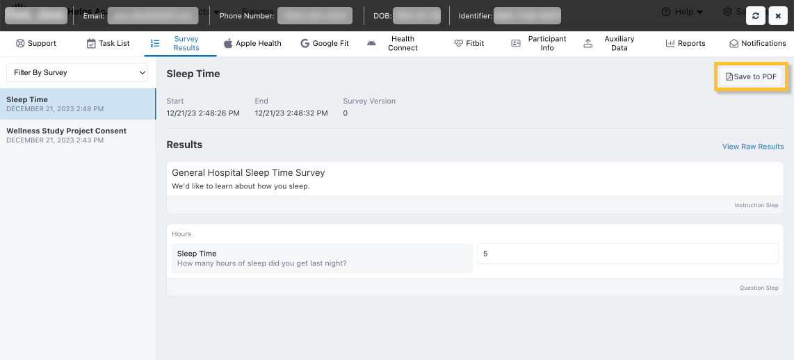 You can view and download a PDF of results for completed surveys from a specific participant on the Participants screen. From the survey builder, you can download a PDF of your survey design.
