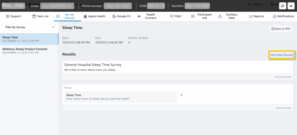 Survey Results can be viewed in either the full or raw formats, allowing coordinators to quickly view participant answers and survey metadata.